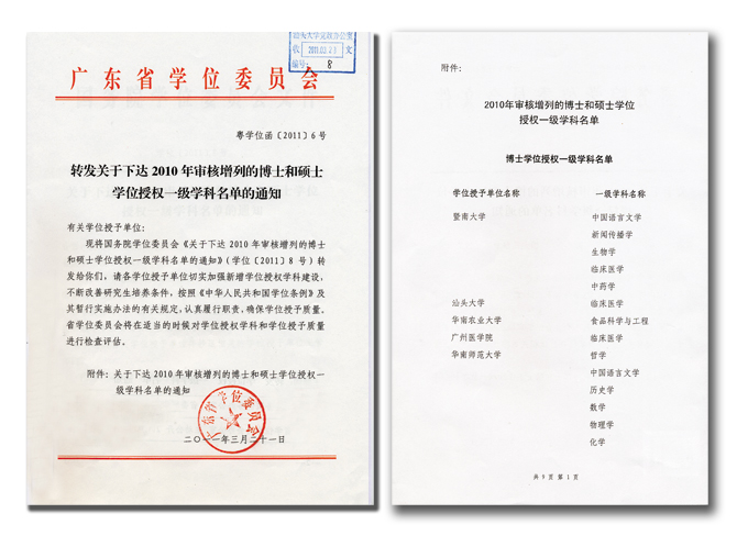 日前,广东省学位委员会转发了国务院学位委员会下发《关于下达2010年审核增列的博士和硕士学位授权一级学科名单的通知》(学位[2011]8号),正式公布了各学位授予单位在2010年学位授权审核工作中获得批准的授权学科名单。我校新增临床医学博士学位授权一级学科点;中国语言文学、新闻传播学、化学、生物学、机械工程、光学工程 、信息与通信工程 、工商管理等8个硕士学位授权一级学科点。 通过此次学位授权一级学科点的增列,实现了我校博士学位授权一级学科点零的突破,我校硕士学位授权一级学科点由原来的2个增加到10个,实现了硕士学位授权一级学科跨越式发展,拓宽了学校的学科、专业领域,使学科结构和布局进一步优化。